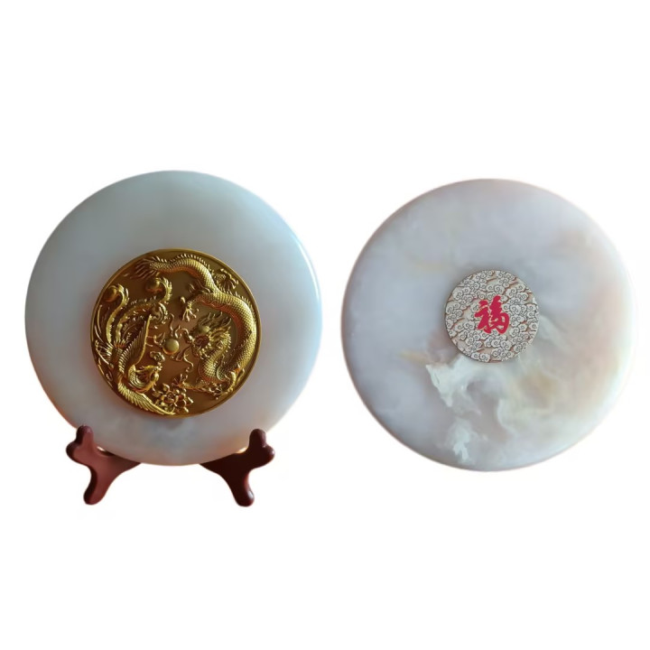 榫卯镶嵌的稳固价值:龙凤纹饰采用 “金属榫卯 + 玉石胶” 双重固定,榫头深入玉盘 2 毫米,可确保百年不脱落 —— 普通摆件多采用 “胶水粘贴”,2-3 年就易脱落,价值折损超 50%。这套龙凤盘的镶嵌工艺,既保障了器物的 “完整性”,也让其长期收藏价值更稳定。